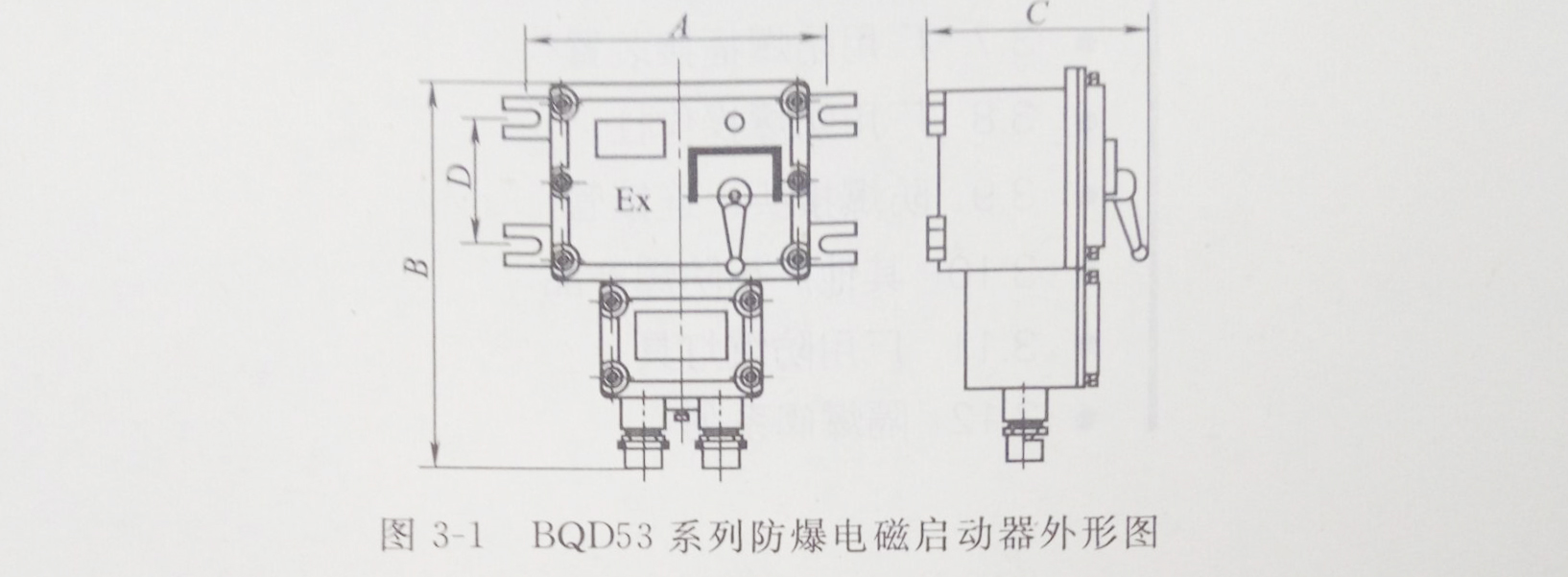 ①结构特点 BQC系列防爆电磁启动器(IIB)为铸铝合金外壳,表面喷塑,内装交流接触器、热继电器、自复位万能转换开关等。外形见图3-2,安装尺寸见表3-3。
