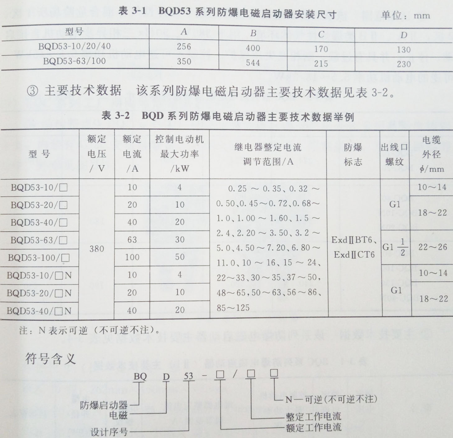 ②适用范围该系列工厂用隔爆型电磁启动器适用于爆炸性气体混合危险场所1区、2区,IIA、IIB类爆炸性气体环境,温度组别为T1〜T4,用于380V、50Hz三相异步电动机直接启动、停止及可逆控制。